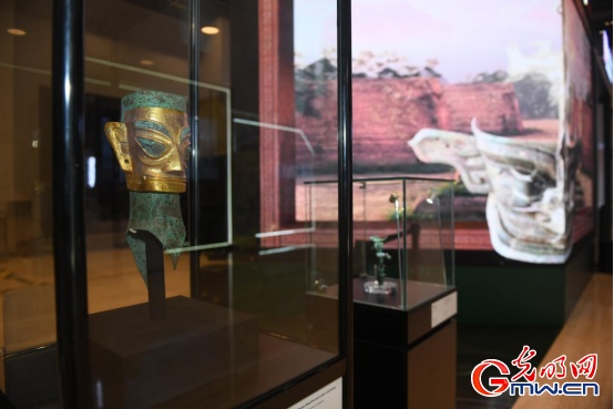 万物有灵·三星堆—金沙古蜀文明数字展展出的戴金面罩青铜人头像。光明网记者 潘迪/摄
