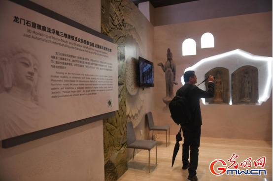 观众在龙门石窟微痕浅浮雕三维建模及纹饰图案的自动理解与建库检索展位拍摄。光明网记者 潘迪/摄