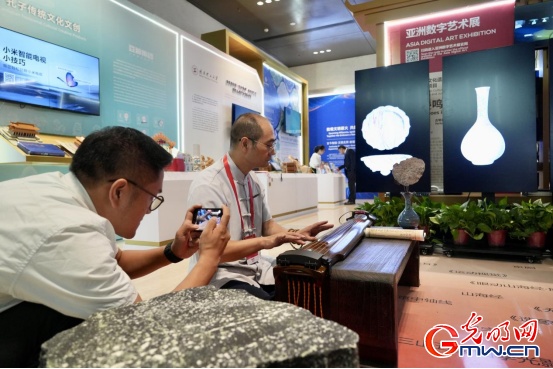 工作人员在亚洲数字艺术展文化遗产古琴与钧瓷交互项目“钧彩叠鸣”展位演奏古琴。光明网记者 赵金悦/摄